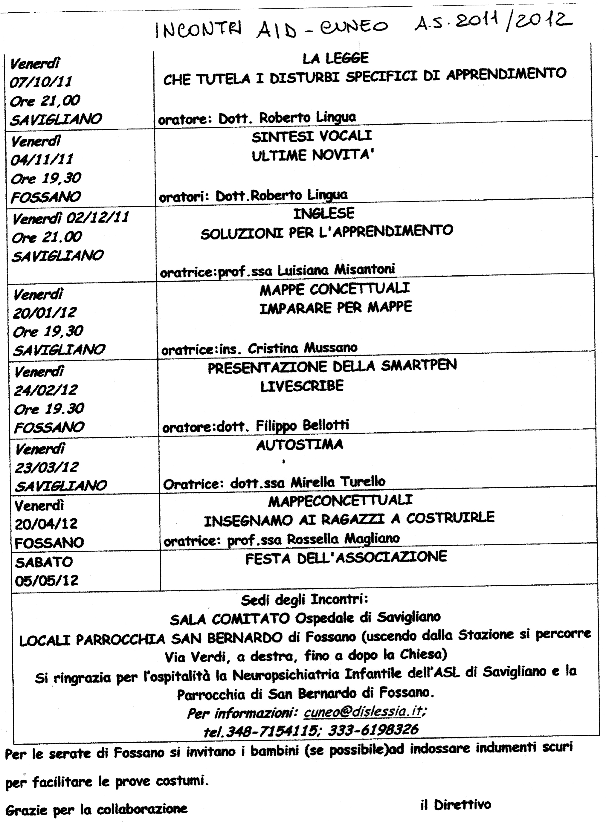 - Gli appunti dei convegni dell'insegnante Elda Fino - vai - Laboratorio grafo-motorio - Roberta Lo Cascio - Savigliano - novembre 2011 - bibliografia - slide - Conferenze dott. Ragazzo Disturbi di Attenzione ed Iperattività - scarica - scarica - Convegno "Lingue straniere e Dislessia" - Savigliano 5.3.2012 - appunti di Paola Rivoira - scarica - Dott. Ragazzo - Corso di aggiornamento - "DDAI e la scuola" - Venasca - 23.4.2012 - slide |
