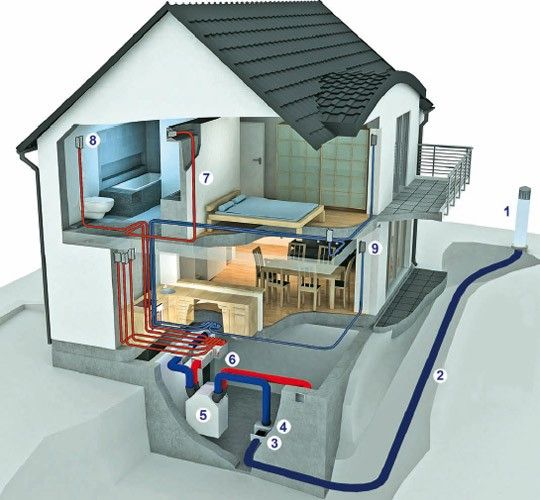 convogliato attraverso un pompa di calore geotermica. Tipicamente le tubazioni