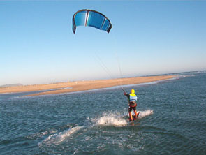 Nella foto marina si vede un kitesurfer che sta andando di bolina o al traverso