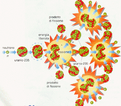 ![]() | La fissione nucleare è una reazione nucleare in cui il nucleo di un elemento pesante ad esempio uranio 235 o plutonio 239 decade in frammenti di minori dimensioni, ovvero in nuclei di atomi a numero atomico inferiore, con emissione di una grande quantità di energia e radioattività. La fissione può avvenire spontaneamente in natura (fissione spontanea) oppure essere indotta tramite bombardamento di neutroni. È la reazione nucleare comunemente utilizzata nei reattori nucleari e nei tipi più semplici di bombe atomiche, quali le bombe all'uranio (come quella che colpì Hiroshima) o al plutonio (come quella che colpì Nagasaki). Tutte le bombe a fissione nucleare vengono militarmente etichettate come Bombe A. |