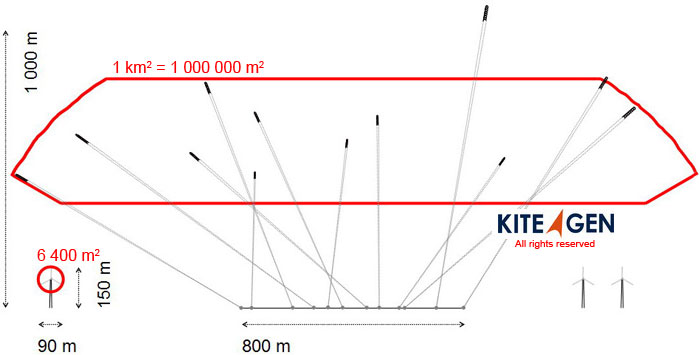 Con tale configurazione le centrali KiteGen sonoin grado di intercettare grandissime quantità di vento in quota in un'unica installazione. Un tipico generatore del tipo "Carousel" ha un diametro di 800 m; la stessa quantità viene raggiunta con circa 150 torri eoliche di ultima generazione. Le torri eoliche infatti hanno bisogno di essere disntanziate l'una dall'altra per evitare che interferiscano fra di loro diminuendo la resa totale e occuperebbero quindi un'area a terra di più di 40Km². La centrale KiteGen, compresa una fascia di rispetto tutt'attorno, occupa circa 5 Km².